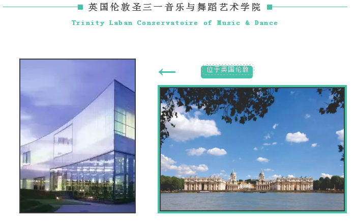 圣三一音乐学院是伦敦四大公立音乐学校之一,也是英国唯一的最大规模的音乐和现代舞多科合并的世界级顶尖音乐学院。学校由圣三一音乐学院及拉邦舞蹈学校于2005年合并而成,音乐学院位于伦敦东南部引人入胜的格林威治区;舞蹈学院位于泰晤士河畔的“拉邦大楼”。